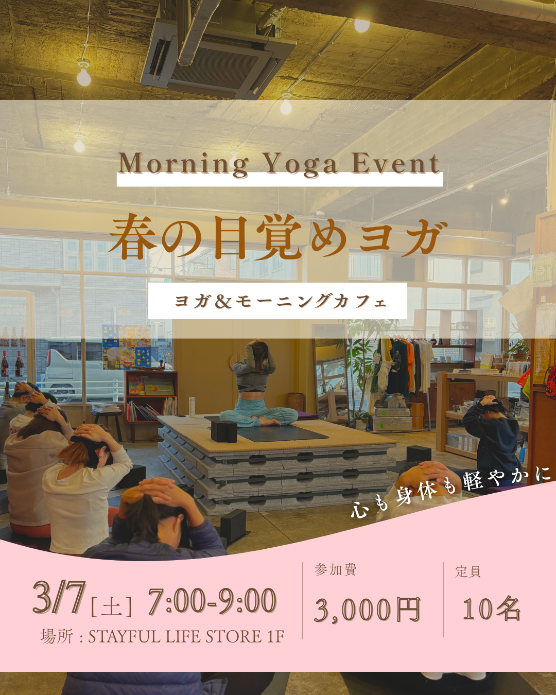STAYFUL LIFE STORE×Yoga Studio Sūtraのコラボイベント当日は6:45に開場します。07:00~ヨガタイム08:00~カフェタイム※会場はSTAYFUL LIFE STORE 1Fです。